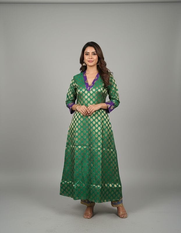 Green Chanderi Silk Long Kurti with V-shaped collar